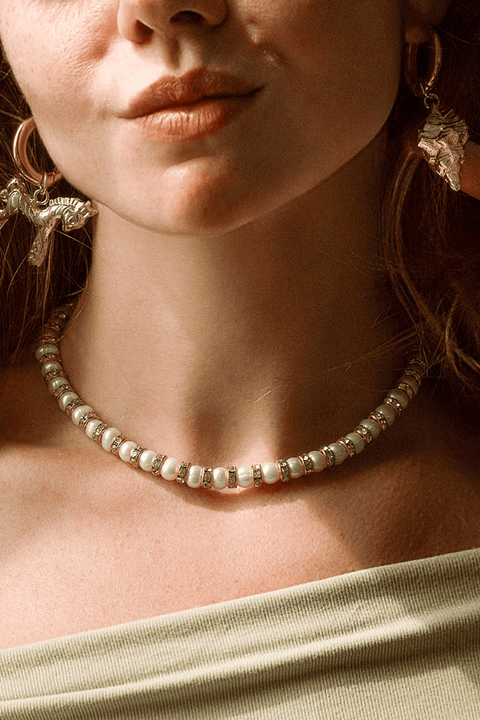 I envisioned this jewelry set as a reverie of Emma Bovary, a burst of beauty in an otherwise bland world. The cultured pearls evoke her illusions of purity, while the shimmering rhinestones capture her bursts of passion, the beating of a heart that dreams too intensely. Jewels like a breath of escape in an ordinary life.